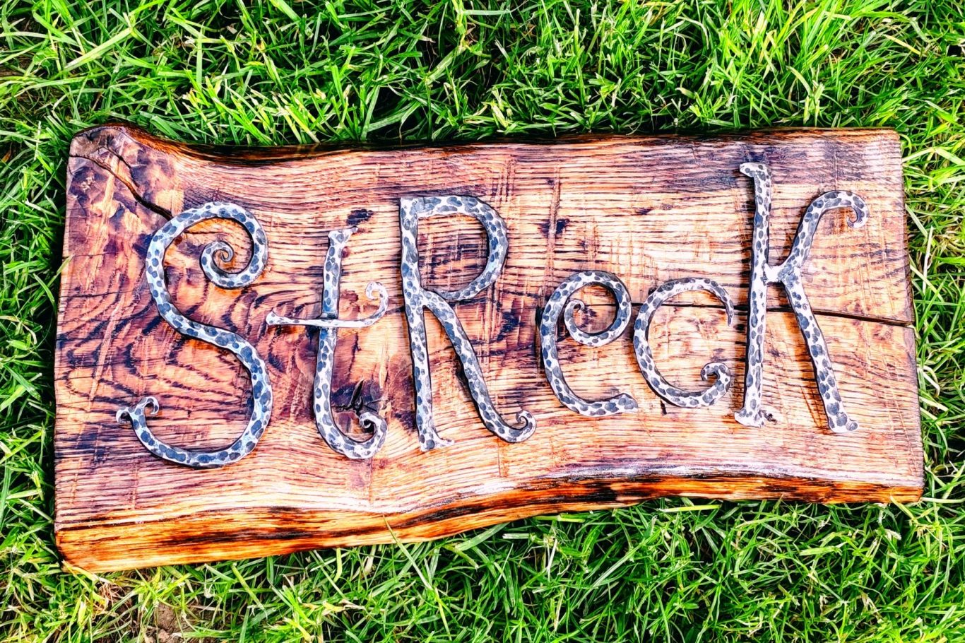 Jeden einzelnen Buchstabe habe ich handgeschmiedet und das Stück Eichenholz stammt von einen Sturmschaden. Den Baumstamm habe ich in grobe Bretter gesägt, die Rinde entfernt und mit Harz versiegelt.