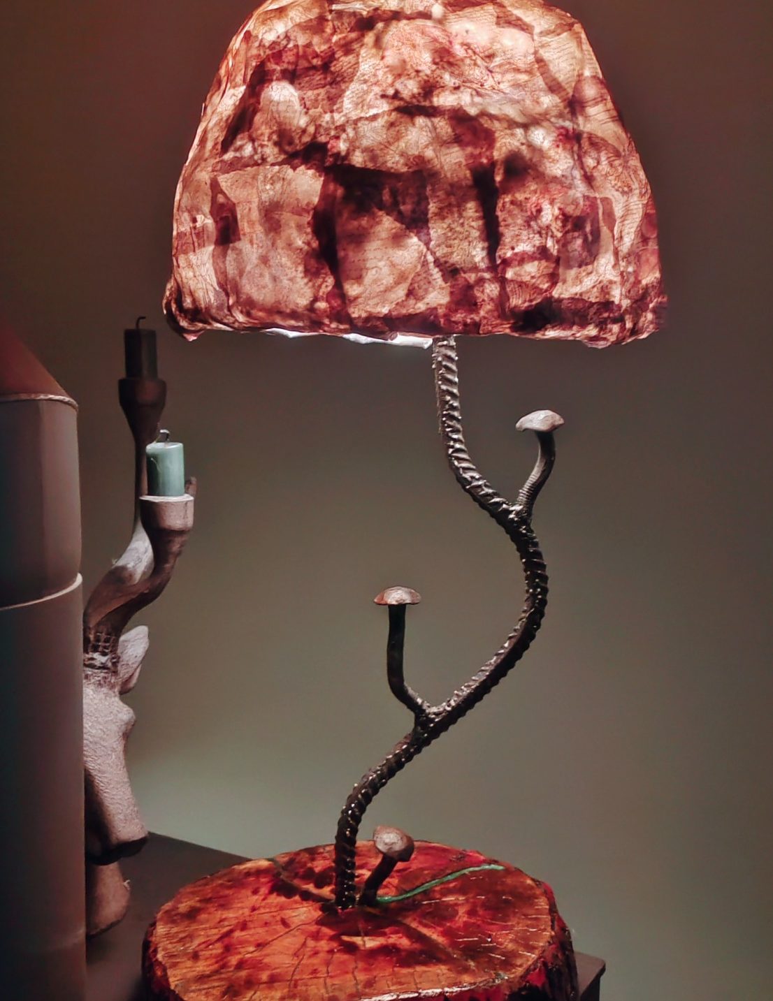 Den Schirm habe ich aus Reißpapier zu einen Pilzhut geformt. Der Stamm besitzt drei Bauschrauben, die ich zu kleinen Pilzen geschmiedet habe. Der Fuß ist eine Baumscheibe, deren Risse ich mit farbigen Epoxidharz versiegelt habe.