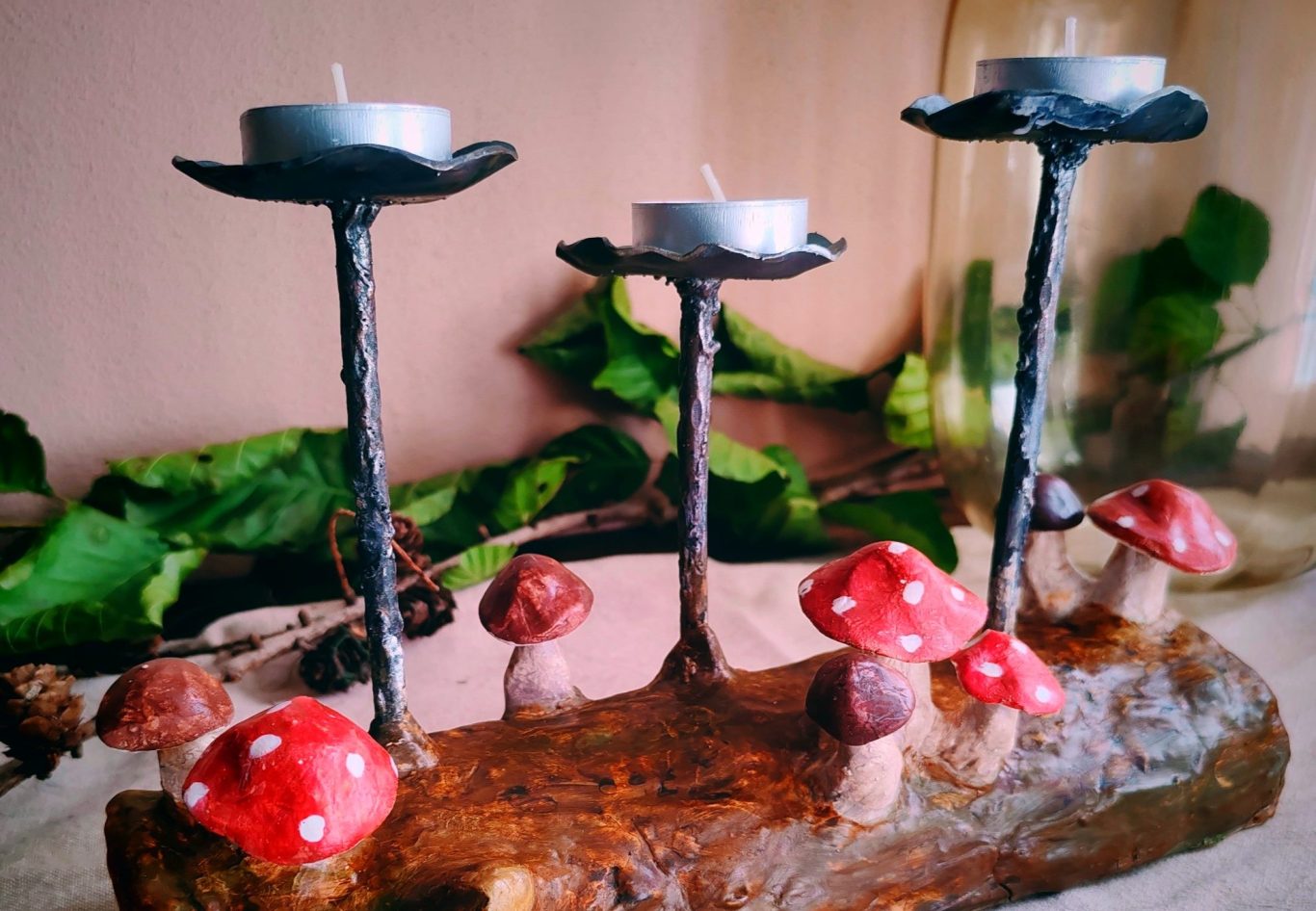 Die Teelichthalter habe ich handgeschmiedet. Sie sind fest in einem Holzstück verankert, welches ich mit Ton ummantelt und mit Pilzen verziert habe. Baumstamm und Pilze spiegeln die Schönheit des Waldes wieder. Sie wurden handbemalt und mit einer wasserdichten lasur versiegelt.