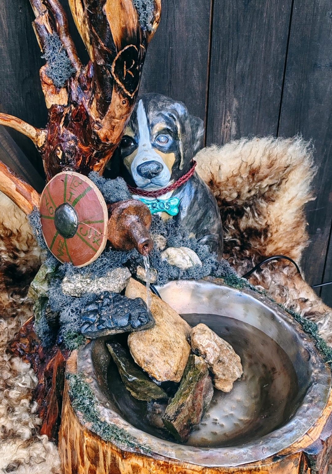 In diesen handgefertigten Meisterstück habe ich all meine Materialen vereint zu einem Zimmerbrunnen/Katzenbrunnen. Den Hund habe ich aus Ton geformt und nach einem Foto handbemalt. Die Trinkschale ist aus Edelstahlblech.